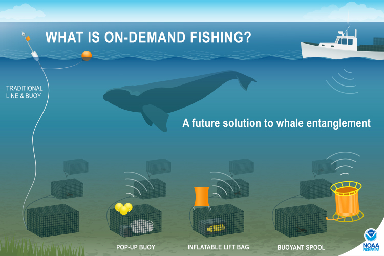 - On-demand, or ropeless, gear. Traditional fishing methods rely on vertical lines connecting traps on the seafloor to surface buoys. On-demand systems eliminate these persistent vertical lines. Instead, gear remains on the ocean floor and is retrieved when triggered by an acoustic signal, significantly reducing the risk of whales becoming entangled.